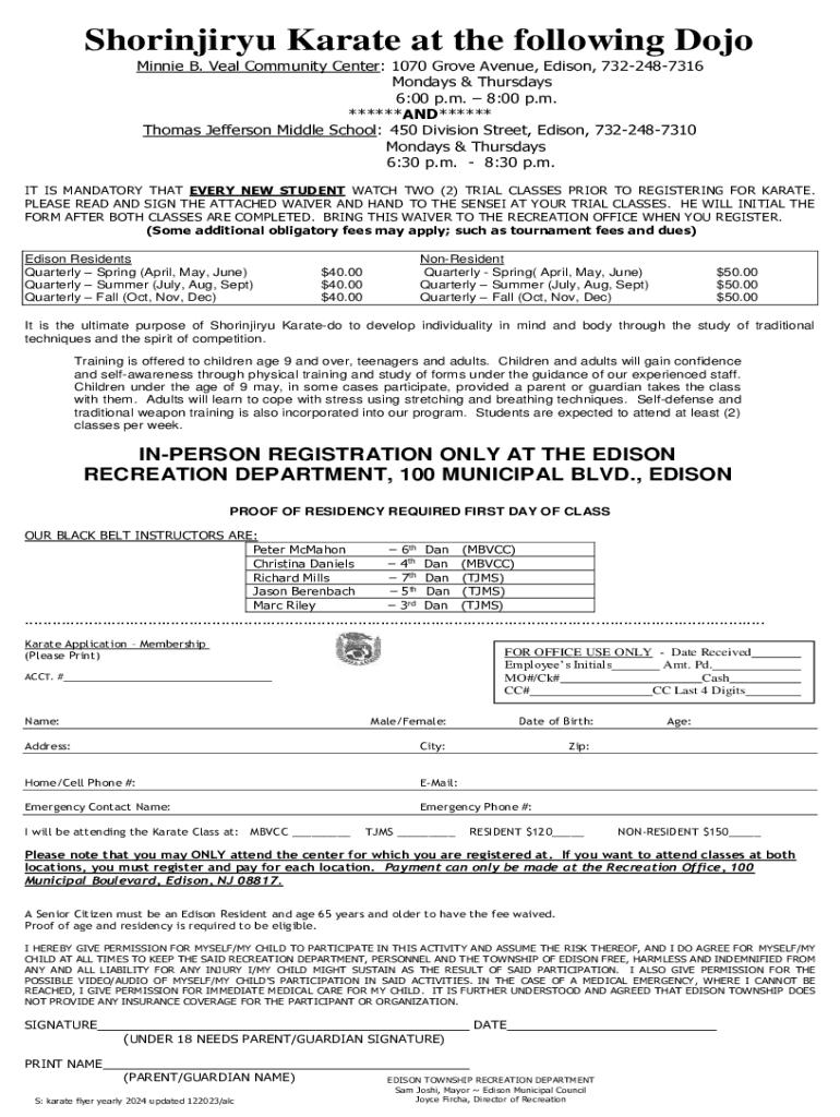 Shorinjiryu Karate at the following Dojo Minnie B. Veal Community Center: 1070 Grove Avenue, Edison, 7322487316 Mondays & Thursdays 6:00 p.m. 8:00 p.m. ******AND****** Thomas Jefferson Middle School: