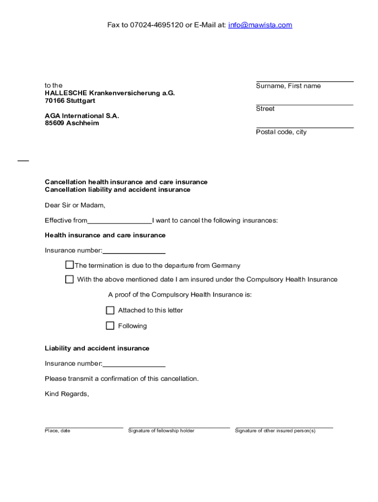 Fax to 070244695120 or EMail at: info@mawista.comto the HALLESCHE Krankenversicherung a.G. 70166 StuttgartSurname, First name StreetAGA International S.A. 85609 AschheimPostal code, cityCancellation