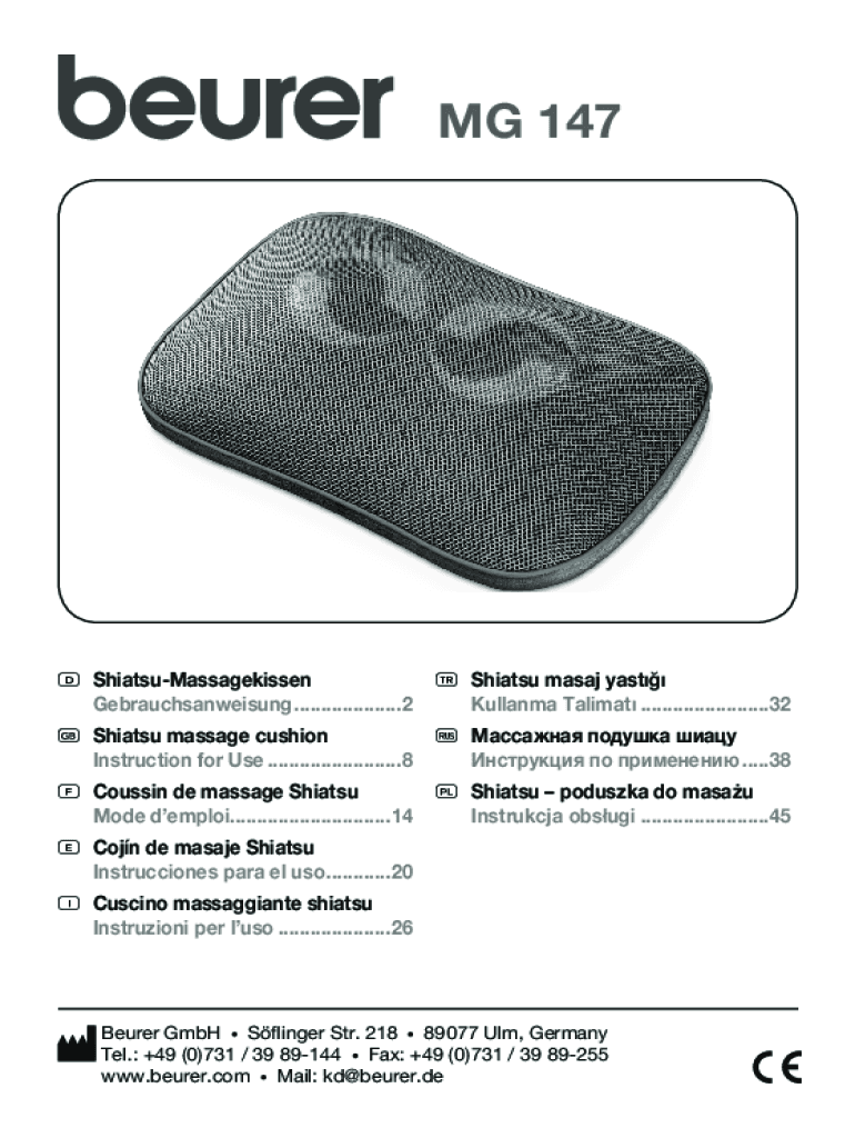 MG 147DShiatsuMassagekissenGebrauchsanweisung.....................2TShiatsu masaj yastKullanma Talimat.........................32GShiatsu massage cushionInstruction for Use..........................8r