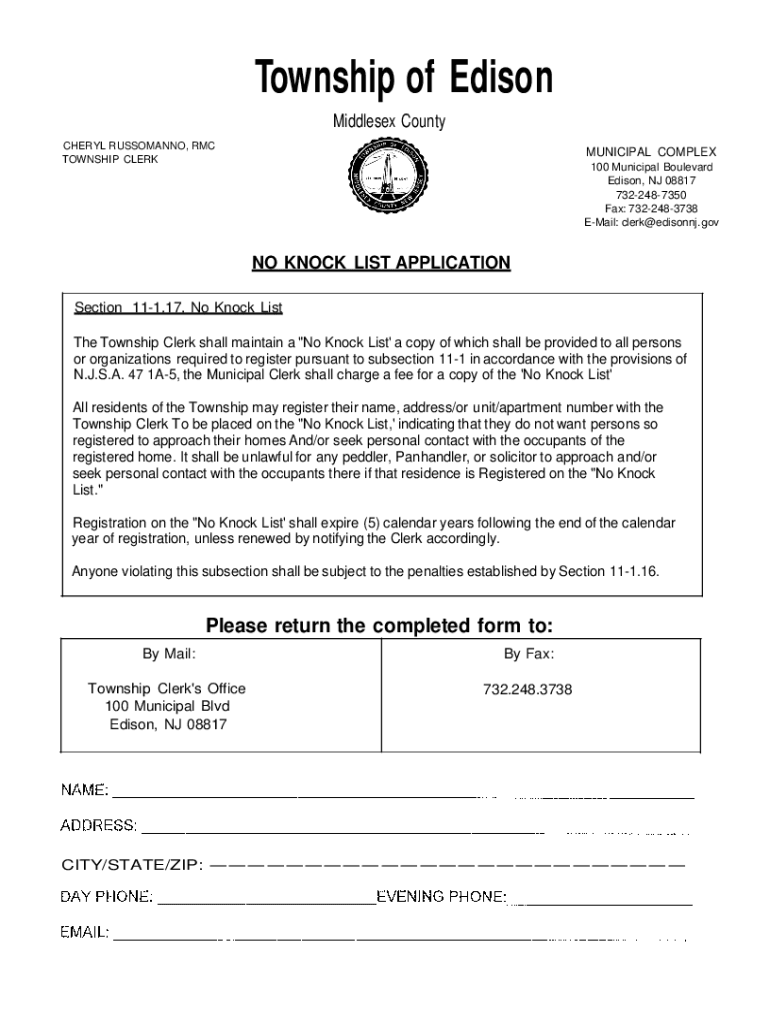 Email: clerk@edisonnj. gov NO KNOCK LIST