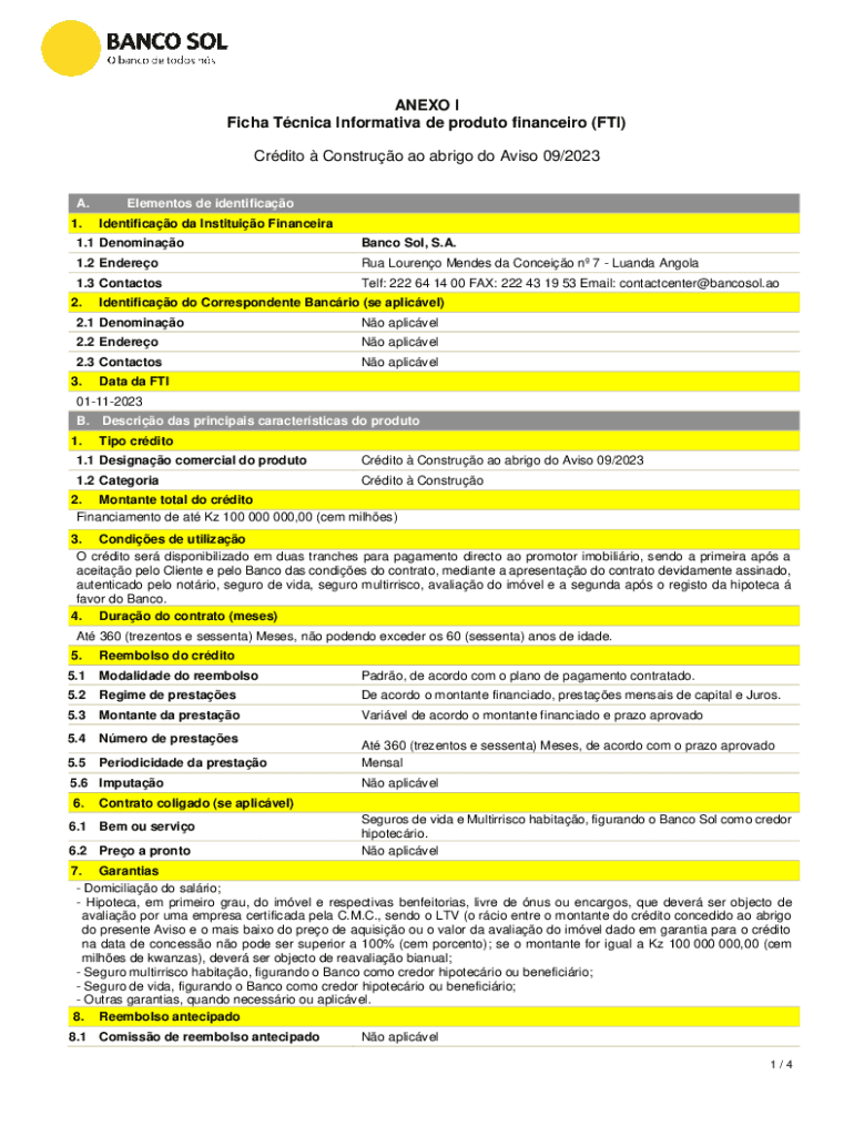 ANEXO I Ficha Tcnica Informativa de produto financeiro (FTI) Crdito Construo ao abrigo do Aviso 09/2023 A. 1.Elementos de identificao Identificao da Instituio Financeira1.1 DenominaoBanco Sol, S.A.1.2