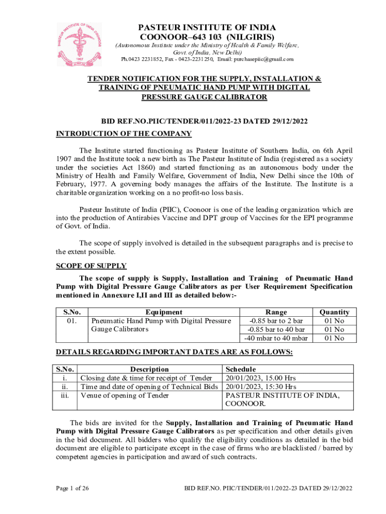 PASTEUR INSTITUTE OF INDIA COONOOR643 103 (NILGIRIS) (Autonomous Institute under the Ministry of Health & Family Welfare, Govt. of India, New Delhi) Ph.0423 2231852, Fax 04232231250, Email: purchasepiic@gmail.comTENDER