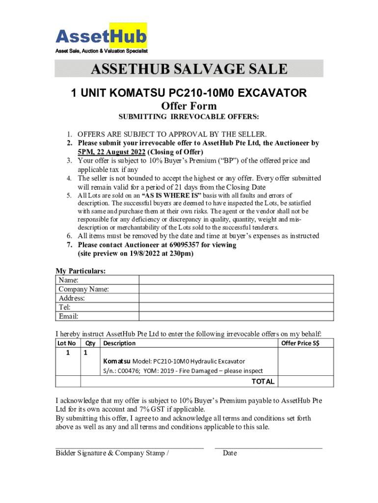 AssetHub Asset Sale, Auction & Valuation SpecialistASSETHUB SALVAGE SALE 1 UNIT KOMATSU PC21010M0 EXCAVATOR Offer Form SUBMITTING IRREVOCABLE OFFERS: 1. OFFERS ARE SUBJECT TO APPROVAL BY THE SELLER.