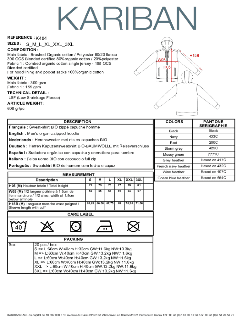 REFERENCE : K484 SIZES :S_M_L_XL_XXL_3XLCOMPOSITION : Main fabric : Brushed Organic cotton / Polyester 80/20 fleece 300 OCS Blended certified 80%organic cotton / 20%polyester Fabric 1 : Combed organic