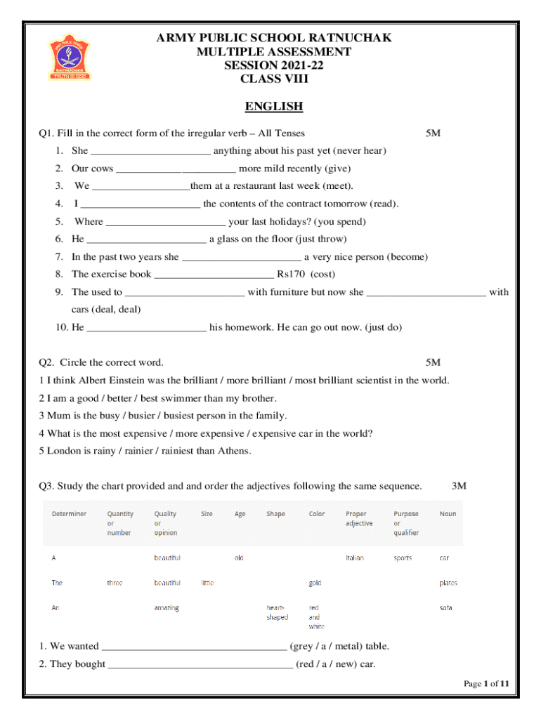 ARMY PUBLIC SCHOOL RATNUCHAK MULTIPLE ASSESSMENT SESSION 202122 CLASS VIII ENGLISH Q1. Fill in the correct form of the irregular verb All Tenses5M1. She ___ anything about his past yet (never hear)