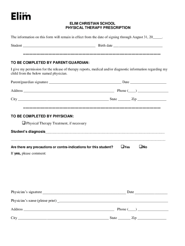 ELIM CHRISTIAN SCHOOL PHYSICAL THERAPY PRESCRIPTION The information on this form will remain in effect from the date of signing through August 31, 20___. Student ___ Birth date ___ TO BE COMPLETED