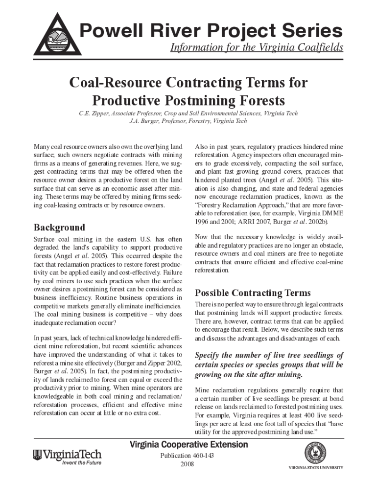 Powell River Project SeriesInformation for the Virginia CoalfieldsCoalResource Contracting Terms for Productive Postmining Forests C.E. Zipper, Associate Professor, Crop and Soil Environmental Sciences,