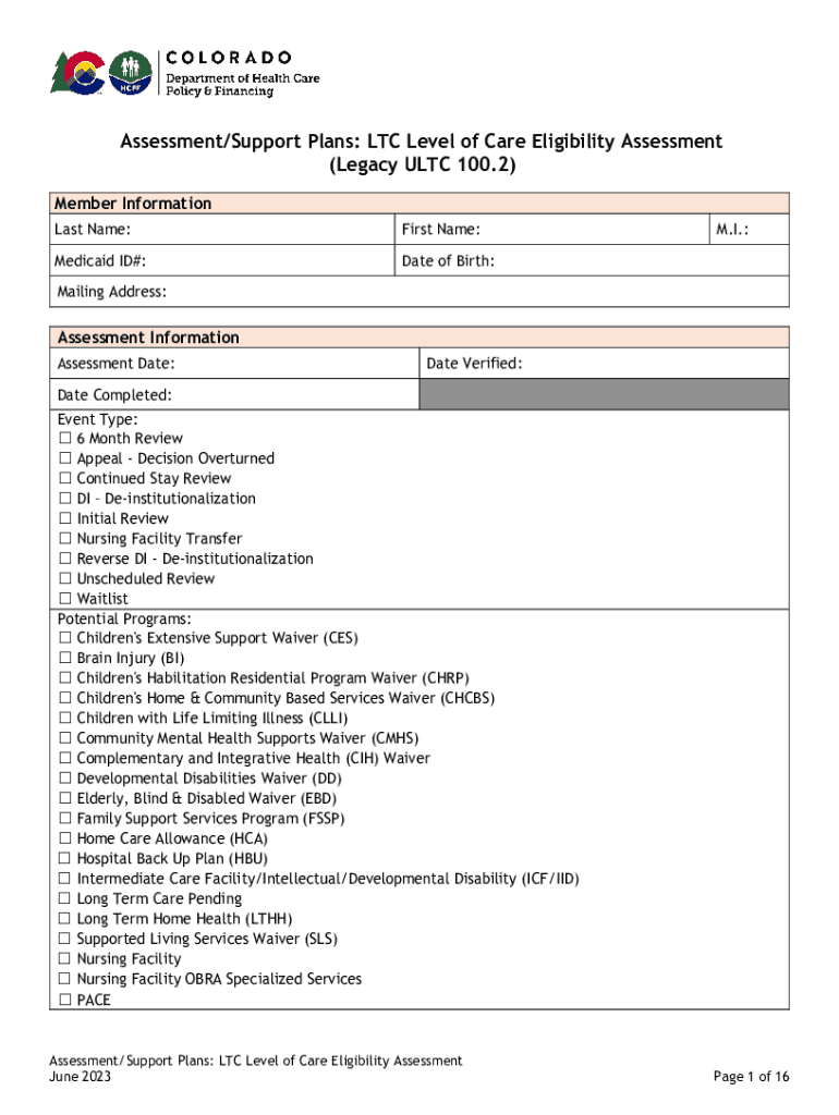 Assessment/Support Plans: LTC Level of Care Eligibility Assessment