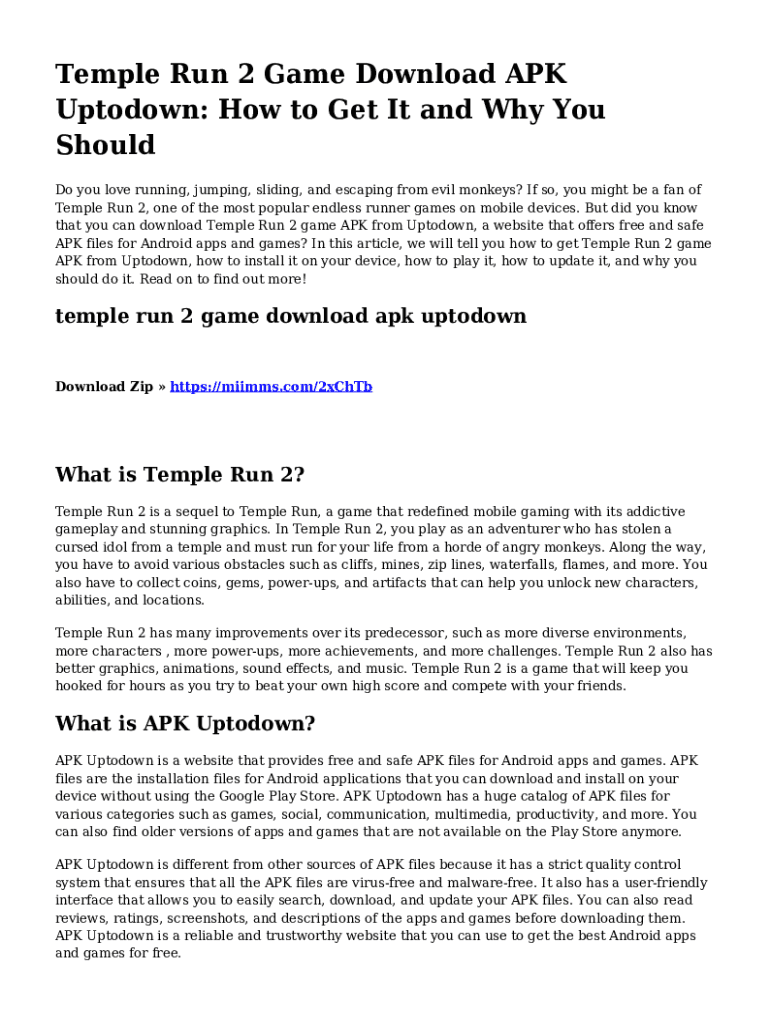Temple Run 2 Game Download APK Uptodown: How to Get It and Why You Should Do you love running, jumping, sliding, and escaping from evil monkeys? If so, you might be a fan of Temple Run 2, one of the