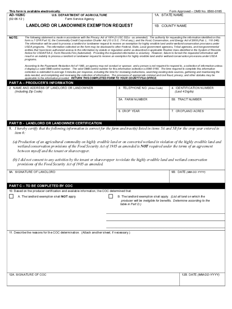 Form Approved OMB No. 05600185This form is available electronically. U.S. DEPARTMENT OF AGRICULTURE (020612 ) Farm Service Agency1A. STATE NAMEAD1026CLANDLORD OR LANDOWNER EXEMPTION REQUEST NOTE:1B.