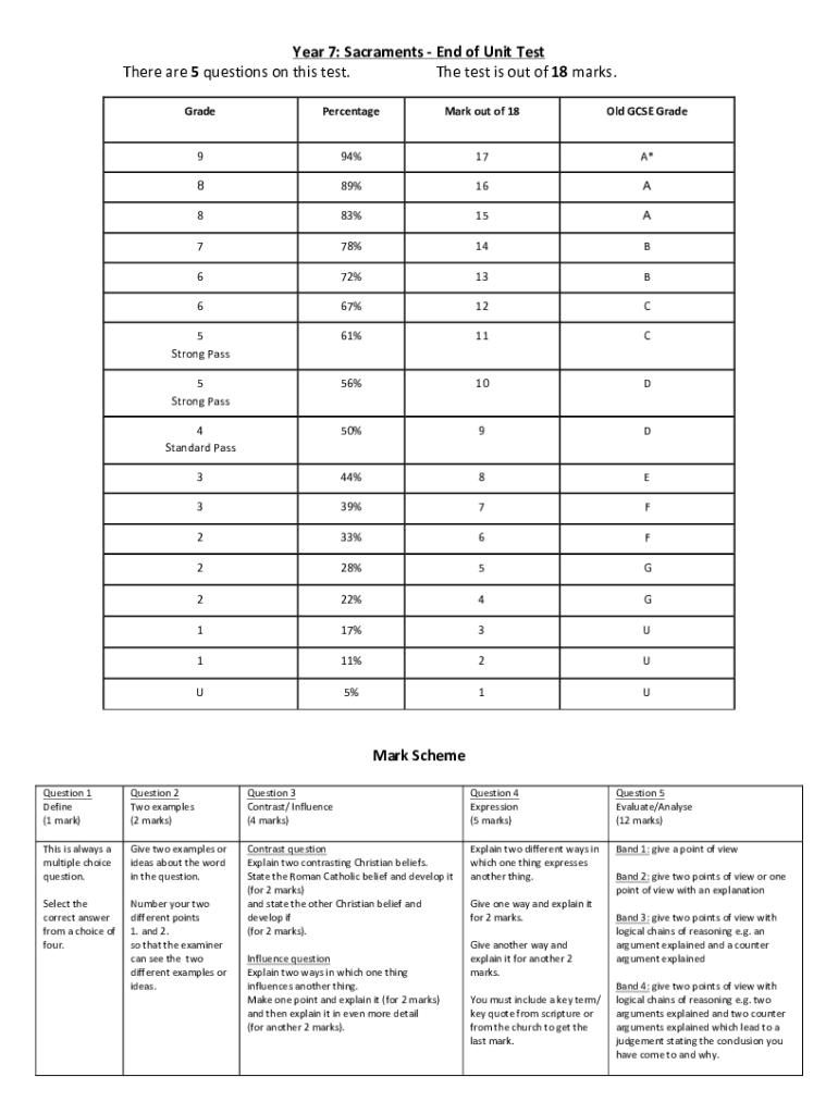 Year 7: Sacraments End of Unit TestThere are 5 questions on this test.The test is out of 18 marks.GradePercentageMark out of 18Old GCSE Grade994%17A*889%16A883%15A778%14B672%13B667%12C5Strong Pass61%11C5Strong