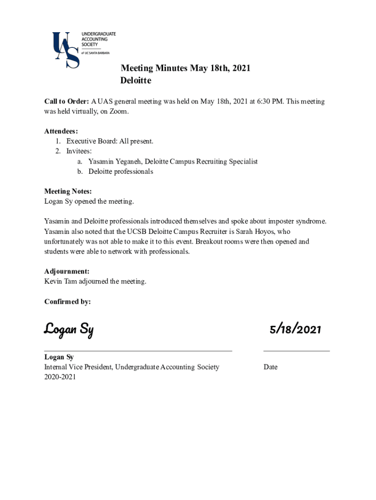Meeting Minutes May 18th, 2021 Deloitte Call to Order: A UAS general meeting was held on May 18th, 2021 at 6:30 PM. This meeting was held virtually, on Zoom. Attendees: 1. Executive Board: All present.
