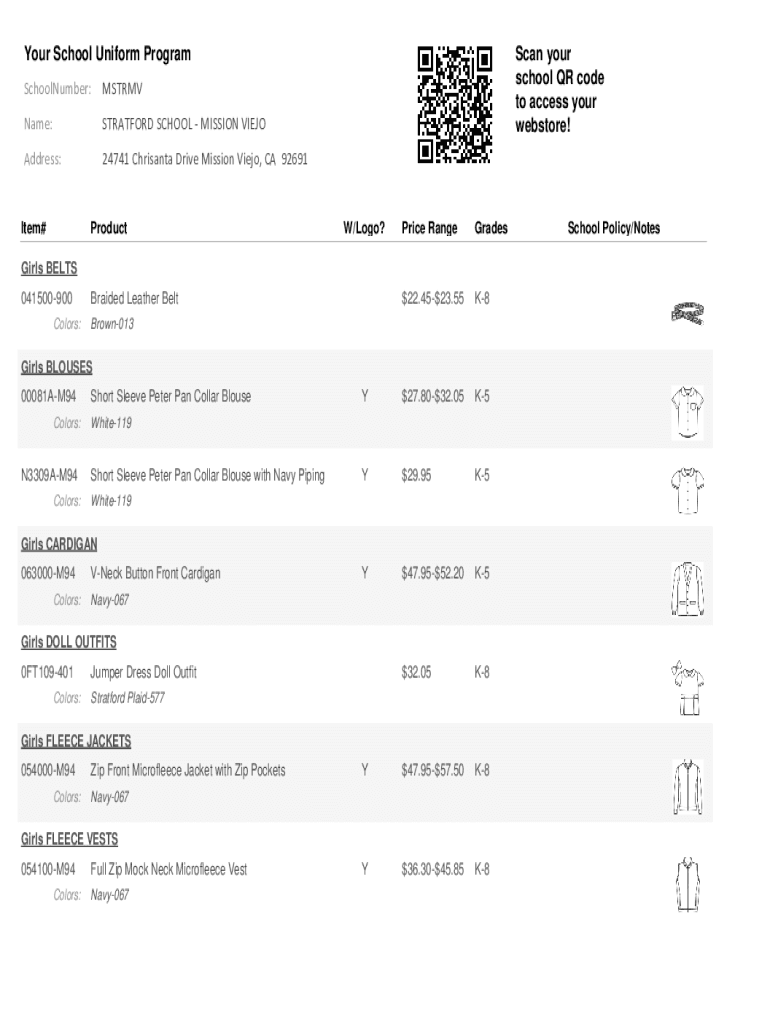 Your School Uniform Program SchoolNumber:MSTRMVName:STRATFORD SCHOOL MISSION VIEJOAddress:24741 Chrisanta Drive Mission Viejo, CA 92691Item#ProductScan your school QR code to access your webstore!W/Logo?Price