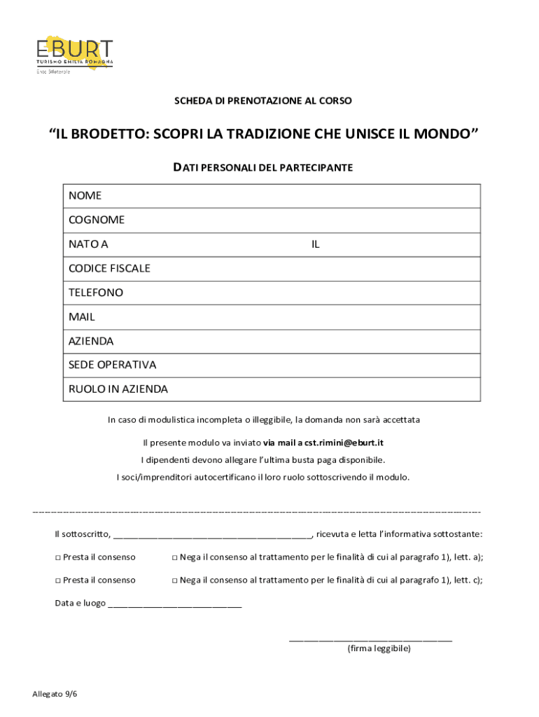 SCHEDA DI PRENOTAZIONE AL CORSOIL BRODETTO: SCOPRI LA TRADIZIONE CHE UNISCE IL MONDO DATI PERSONALI DEL PARTECIPANTE NOME COGNOME NATO AILCODICE FISCALE TELEFONO MAIL AZIENDA SEDE OPERATIVA RUOLO