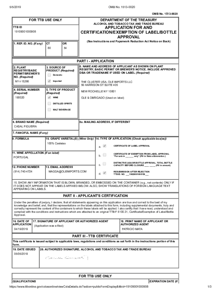 5/5/2019OMB No. 15130020 OMB No. 15130020FOR TTB USE ONLYDEPARTMENT OF THE TREASURY ALCOHOL AND TOBACCO TAX AND TRADE BUREAUAPPLICATION FOR AND CERTIFICATION/EXEMPTION OF LABEL/BOTTLE APPROVALTTB