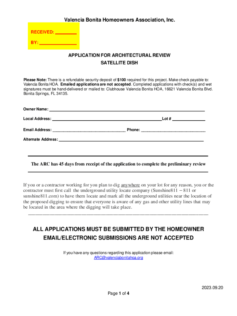 Valencia Bonita Homeowners Association, Inc. RECEIVED: BY:APPLICATION FOR ARCHITECTURAL REVIEW SATELLITE DISHPlease Note: There is a refundable security deposit of $100 required for this project.