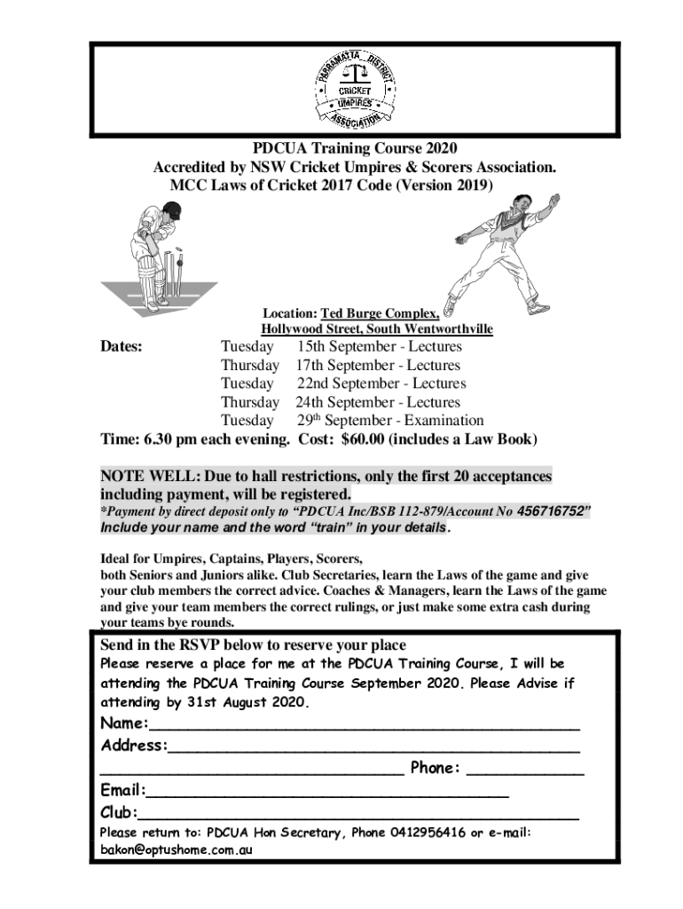 PDCUA Training Course 2020 Accredited by NSW Cricket Umpires & Scorers Association. MCC Laws of Cricket 2017 Code (Version 2019)Location: Ted Burge Complex, Hollywood Street, South WentworthvilleDates:Tuesday