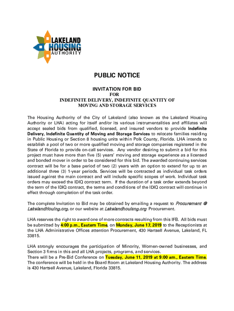 PUBLIC NOTICE INVITATION FOR BID FOR INDEFINITE DELIVERY, INDEFINITE QUANTITY OF MOVING AND STORAGE SERVICES The Housing Authority of the City of Lakeland (also known as the Lakeland Housing Authority