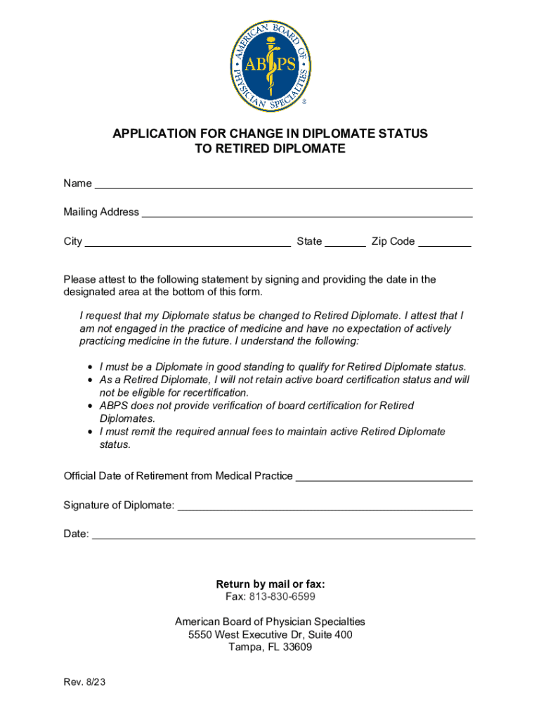 Retired diplomates who wish to change their status to retired must file this application, indicating their intention to retire from active practice.