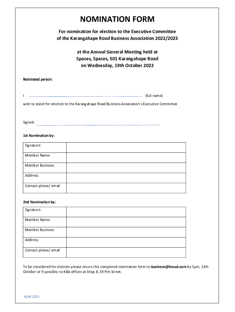 NOMINATION FORM For nomination for election to the Executive Committee of the Karangahape Road Business Association 2022/2023 at the Annual General Meeting held at Spaces, Spaces, 501 Karangahape