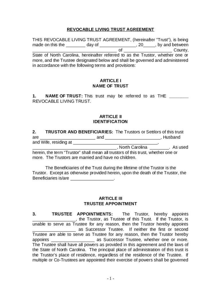 REVOCABLE LIVING TRUST AGREEMENT THIS REVOCABLE LIVING TRUST AGREEMENT, (hereinafter \"Trust\"), is being made on this the ___ day of ___, 20___, by and between ___ of ___ County, State of North Carolina,