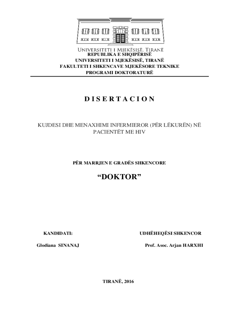 REPUBLIKA E SHQIPRIS UNIVERSITETI I MJEKSIS, TIRAN FAKULTETI I SHKENCAVE MJEKSORE TEKNIKE PROGRAMI DOKTORATURDISERTACIONKUJDESI DHE MENAXHIMI INFERMIEROR (PR LKURN) N PACIENTT ME HIVPR MARRJEN E GRADS