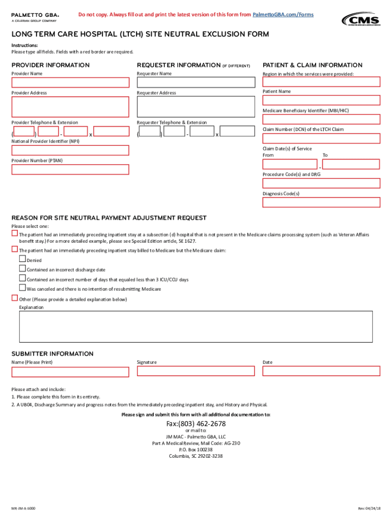 Do not copy. Always fill out and print the latest version of this form from PalmettoGBA.com/FormsLONG TERM CARE HOSPITAL (LTCH) SITE NEUTRAL EXCLUSION FORM Instructions: Please type all fields. Fields