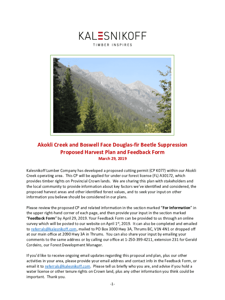 BC Ferries ForumAkokli Creek and Boswell Face Douglasfir Beetle Suppression Proposed Harvest Plan and Feedback Form March 29, 2019 Kalesnikoff Lumber Company has developed a proposed cutting permit