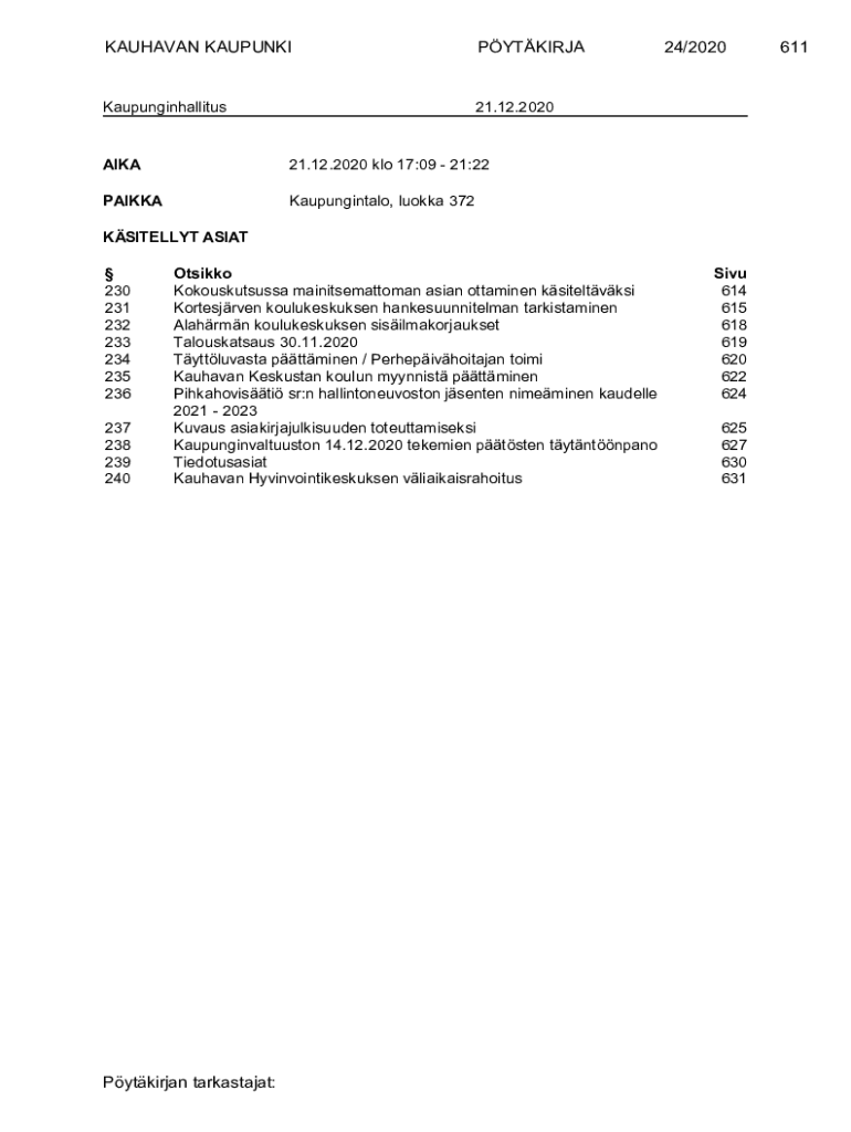 KAUHAVAN KAUPUNKIPYTKIRJAKaupunginhallitus21.12.2020AIKA21.12.2020 klo 17:09 21:22PAIKKAKaupungintalo, luokka 37224/2020KSITELLYT ASIAT 230 231 232 233 234 235 236 237 238 239 240Otsikko Kokouskutsussa