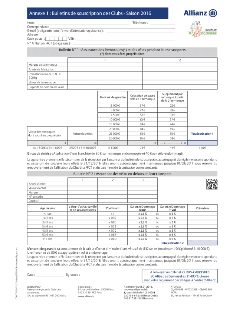 Annexe 1 : Bulletins de souscription des Clubs Saison 2016 Nom : ___ Tlphone : ___ Correspondant : ___ Email (obligatoire pour lenvoi dattestation/quittance) : ___ Adresse : ___ Code postal : Ville