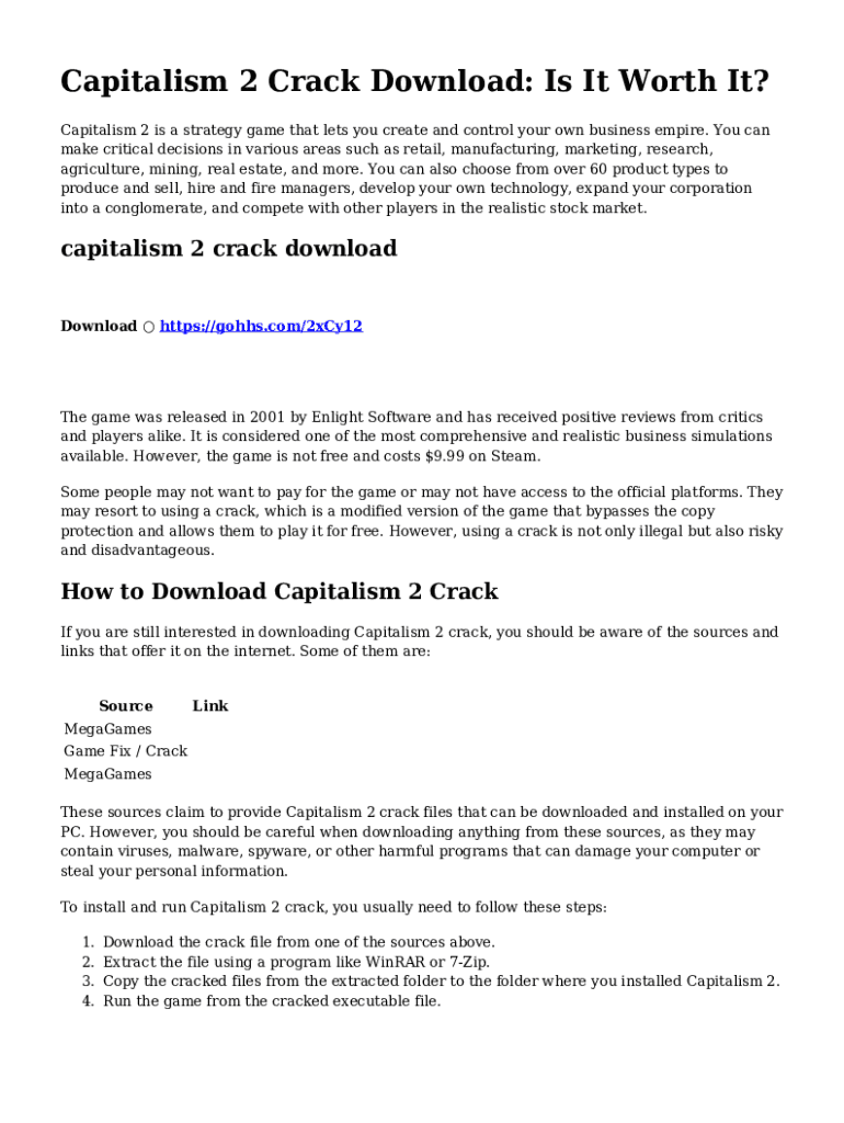 Capitalism 2 Crack Download: Is It Worth It? Capitalism 2 is a strategy game that lets you create and control your own business empire. You can make critical decisions in various areas such as retail,