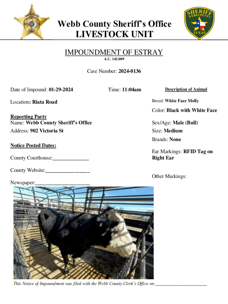 Webb County Sheriffs Office LIVESTOCK UNIT IMPOUNDMENT OF ESTRAY A.C. 142.009Case Number: 20240136Date of Impound: 01292024 Location: Riata RoadTime: 11:04amDescription of Animal Breed: White Face