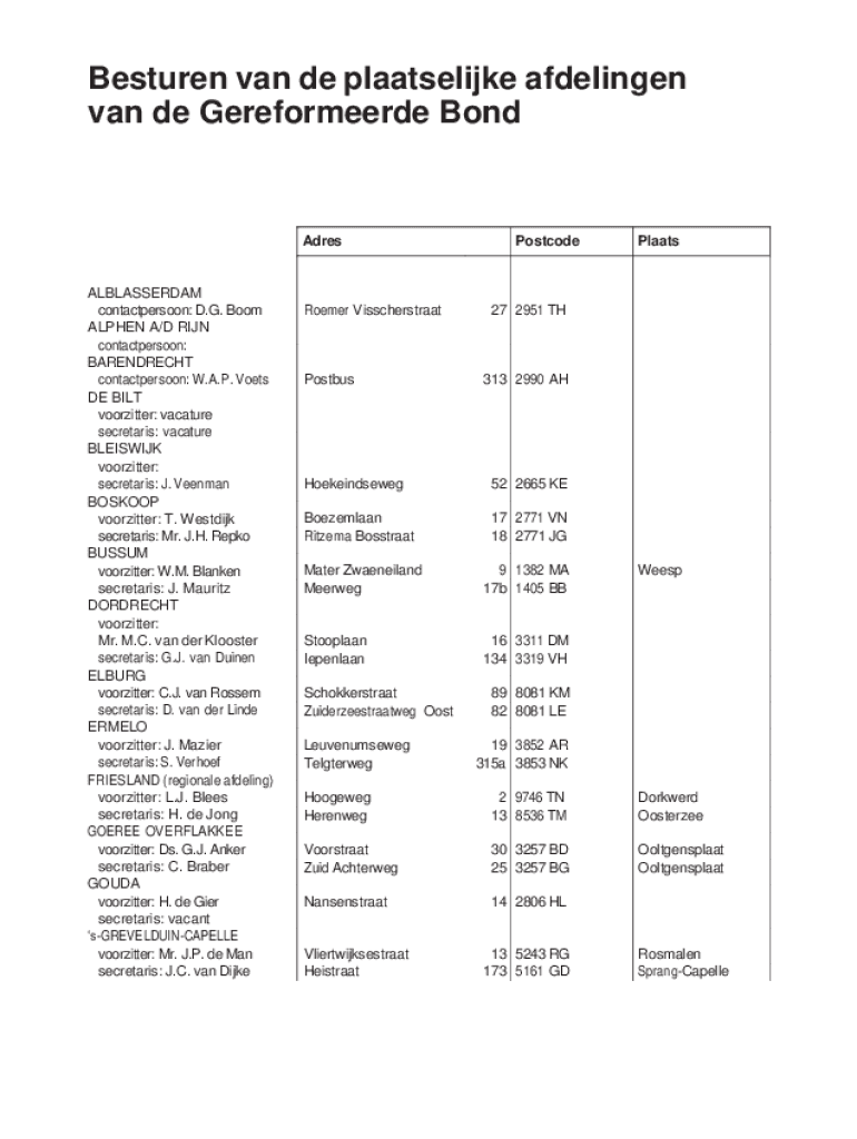 Besturen van de plaatselijke afdelingen van de Gereformeerde BondAdresALBLASSERDAM contactpersoon: D.G. Boom ALPHEN A/D RIJN contactpersoon: BARENDRECHT contactpersoon: W.A.P. Voets DE BILT voorzitter: