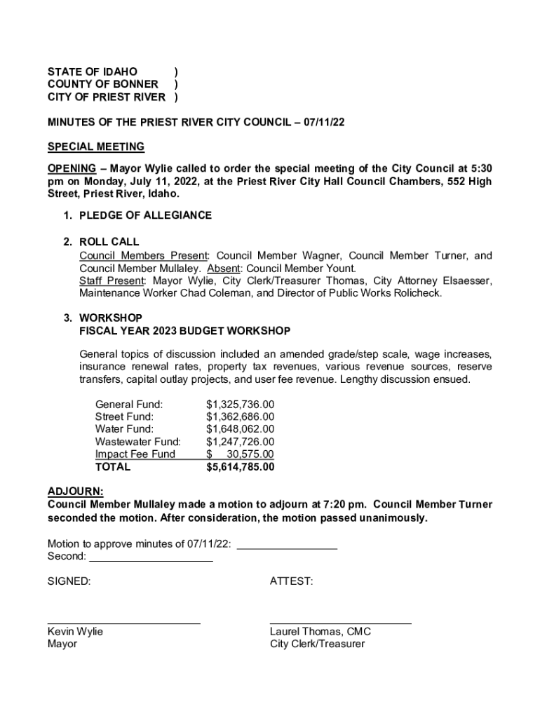 STATE OF IDAHO ) COUNTY OF BONNER ) CITY OF PRIEST RIVER ) MINUTES OF THE PRIEST RIVER CITY COUNCIL 07/11/22 SPECIAL MEETING OPENING Mayor Wylie called to order the special meeting of the City Council