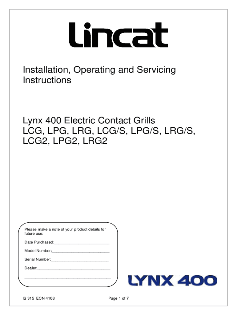 Installation, Operating and Servicing InstructionsLynx 400 Electric Contact Grills LCG, LPG, LRG, LCG/S, LPG/S, LRG/S, LCG2, LPG2, LRG2Please make a note of your product details for future use: Date
