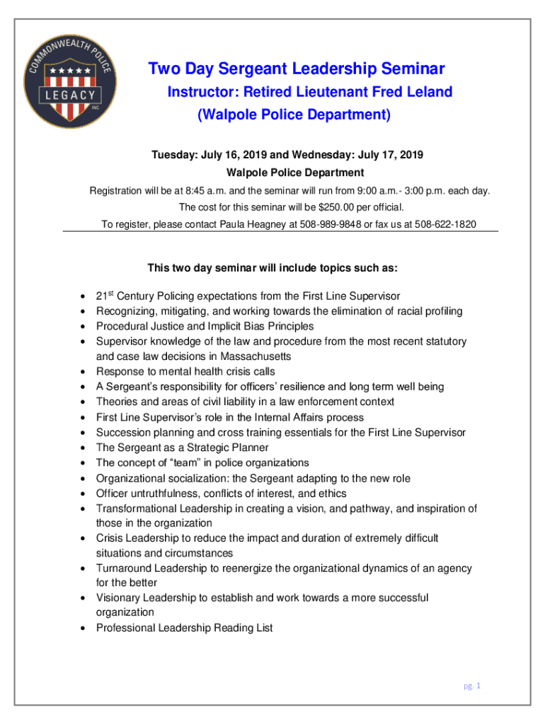 Two Day Sergeant Leadership Seminar Instructor: Retired Lieutenant Fred Leland (Walpole Police Department) Tuesday: July 16, 2019 and Wednesday: July 17, 2019 Walpole Police Department Registration