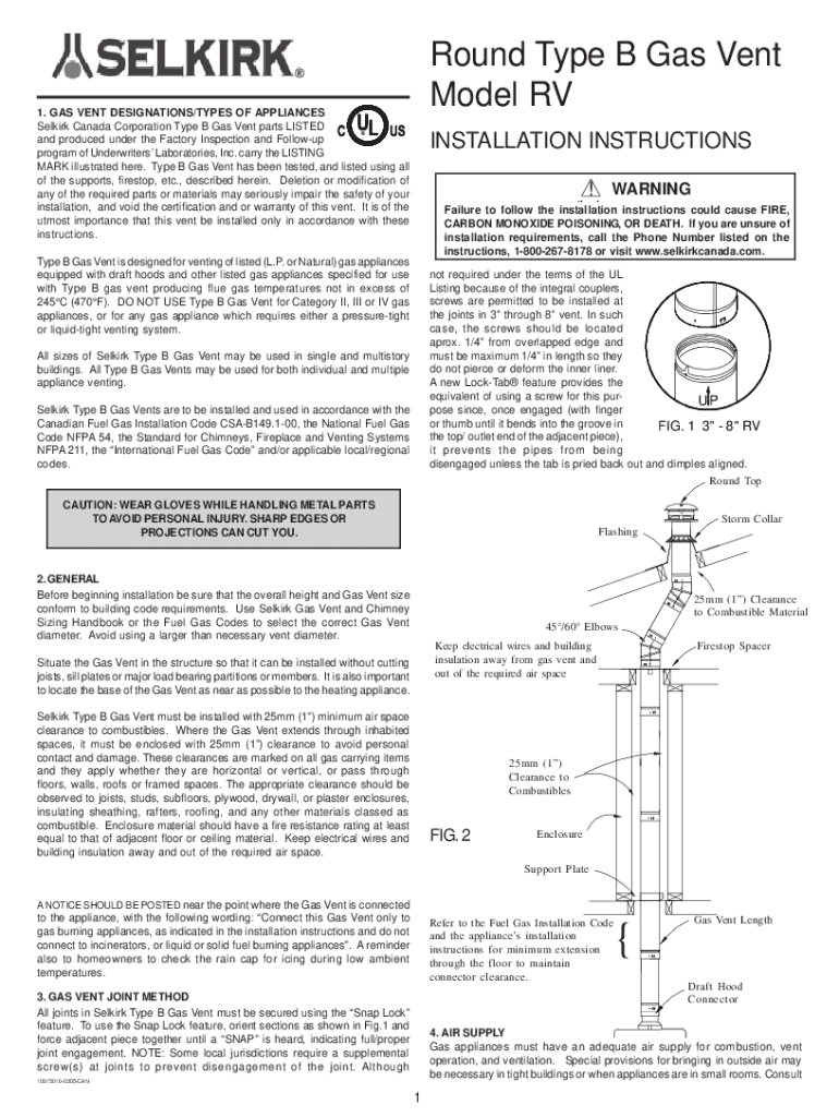 Round Type B Gas Vent Model RV1. GAS VENT DESIGNATIONS/TYPES OF APPLIANCES Selkirk Canada Corporation Type B Gas Vent parts LISTED and produced under the Factory Inspection and Followup program of