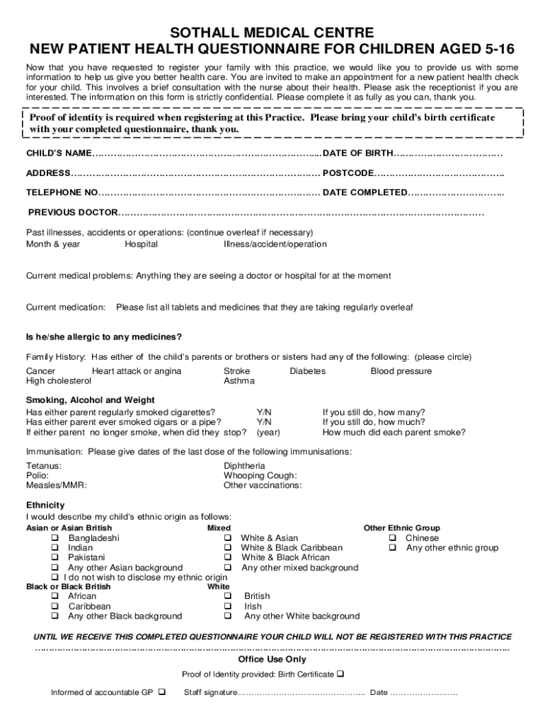 SOTHALL MEDICAL CENTRE NEW PATIENT HEALTH QUESTIONNAIRE FOR CHILDREN AGED 516 Now that you have requested to register your family with this practice, we would like you to provide us with some information