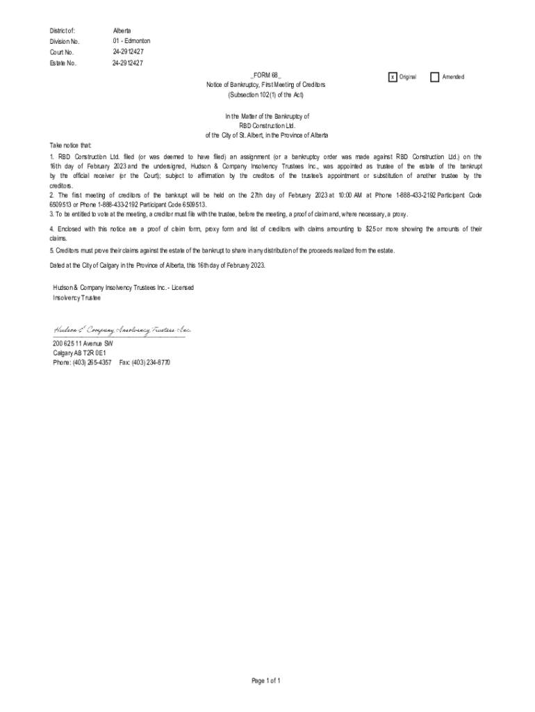 District of: Division No.Alberta 01 EdmontonCourt No.242912427Estate No.242912427 _FORM 68_ Notice of Bankruptcy, First Meeting of Creditors (Subsection 102(1) of the Act)XOriginalAmendedIn the Matter