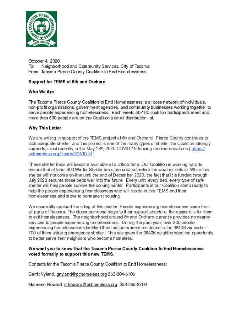 October 4, 2020 To: Neighborhood and Community Services, City of Tacoma From: Tacoma Pierce County Coalition to End Homelessness Support for TEMS at 6th and Orchard Who We Are: The Tacoma Pierce County
