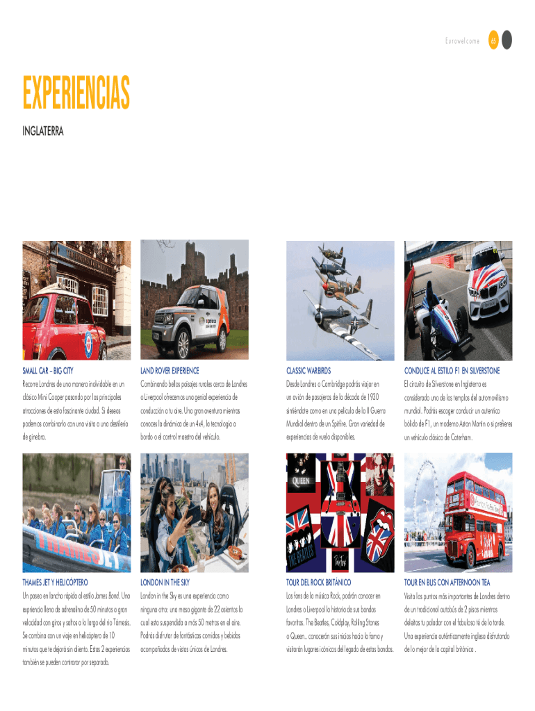 Eurowelcome65EXPERIENCIAS INGLATERRASMALL CAR BIG CITY Recorre Londres de una manera inolvidable en un clsico Mini Cooper pasando por las principales atracciones de esta fascinante ciudad. Si deseas
