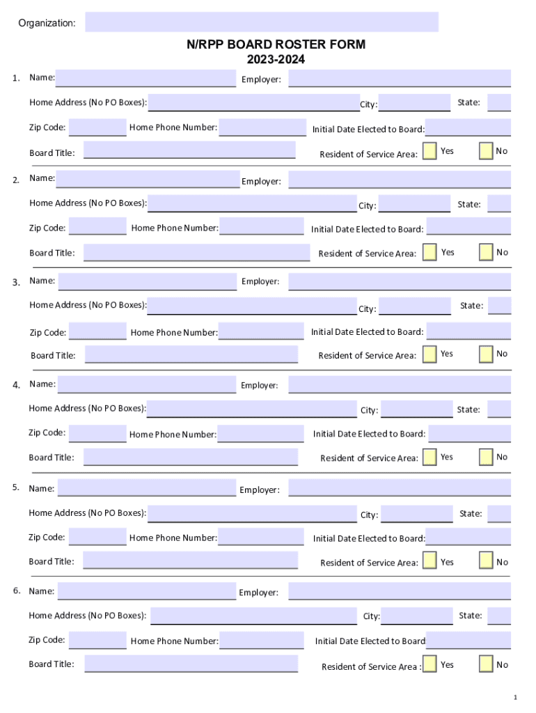 Organization:N/RPP BOARD ROSTER FORM 20232024 1. Name:Employer:Home Address (No PO Boxes): Zip Code:Home Phone Number:Initial Date Elected to Board:Board Title: 2.Resident of Service Area:Name:Home