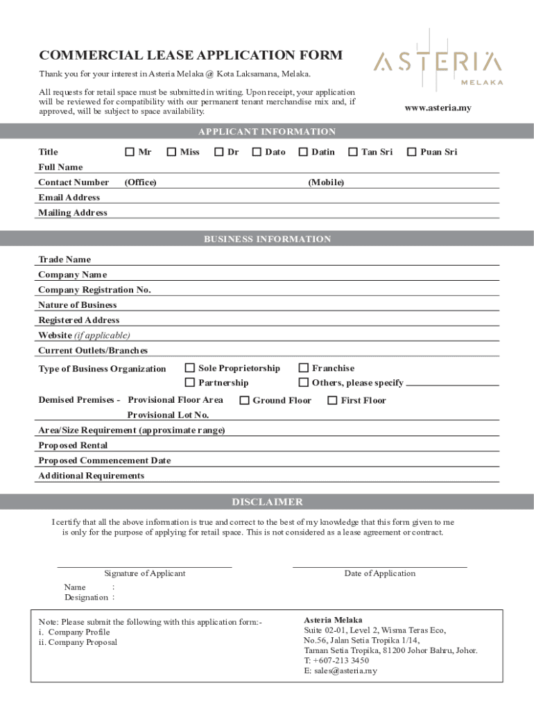 COMMERCIAL LEASE APPLICATION FORM Thank you for your interest in Asteria Melaka @ Kota Laksamana, Melaka. All requests for retail space must be submitted in writing. Upon receipt, your application
