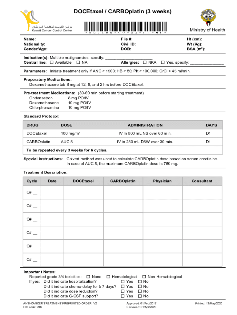 / (3 weeks) Ministry of HealthKuwait Cancer Control CenterName: Nationality: Gender/Age:File #: Civil ID: DOB:Ht (cm): Wt (Kg): BSA (m):Indication(s): Multiple malignancies, specify: ___ Central line: