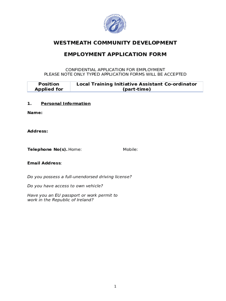 Instructions for the form Local Training Initiative Assistant Co-ordinator - part time