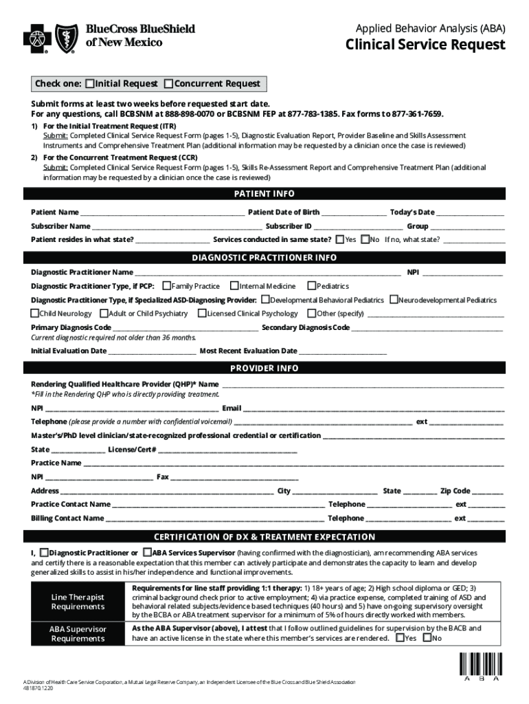 Applied Behavior Analysis (ABA)Clinical Service Request Check one:Initial RequestConcurrent RequestSubmit forms at least two weeks before requested start date. For any questions, call BCBSNM at 8888980070