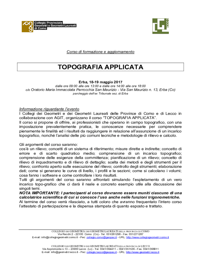 Corso di formazione e aggiornamentoTOPOGRAFIA APPLICATA Erba, 1819 maggio 2017 dalle ore 09:00 alle ore 13:00 e dalle ore 14:00 alle ore 18:00 c/o Oratorio Maria Immacolata Parrocchia San Maurizio