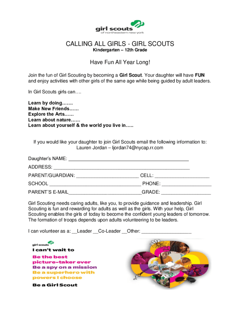 CALLING ALL GIRLS GIRL SCOUTS Kindergarten 12th GradeHave Fun All Year Long! Join the fun of Girl Scouting by becoming a Girl Scout. Your daughter will have FUN and enjoy activities with other girls