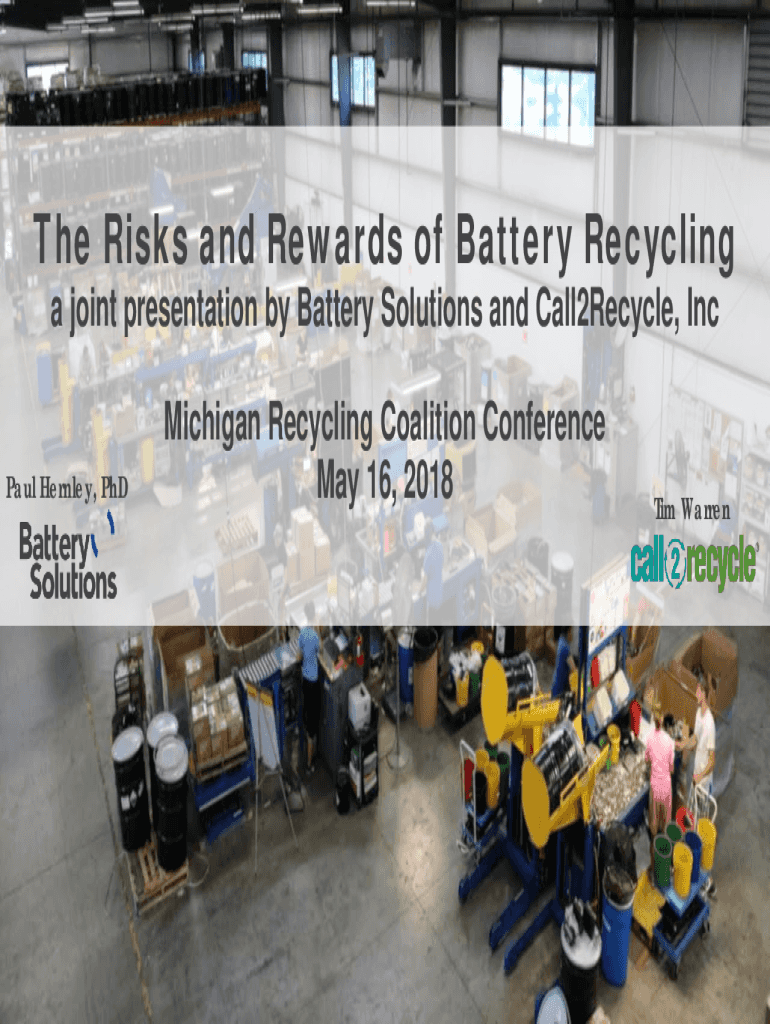 The Risks and Rewards of Battery Recycling a joint presentation by Battery Solutions and Call2Recycle, Inc Paul Hernley, PhDMichigan Recycling Coalition Conference May 16, 2018Tim Warren2018 Call2Recycle,