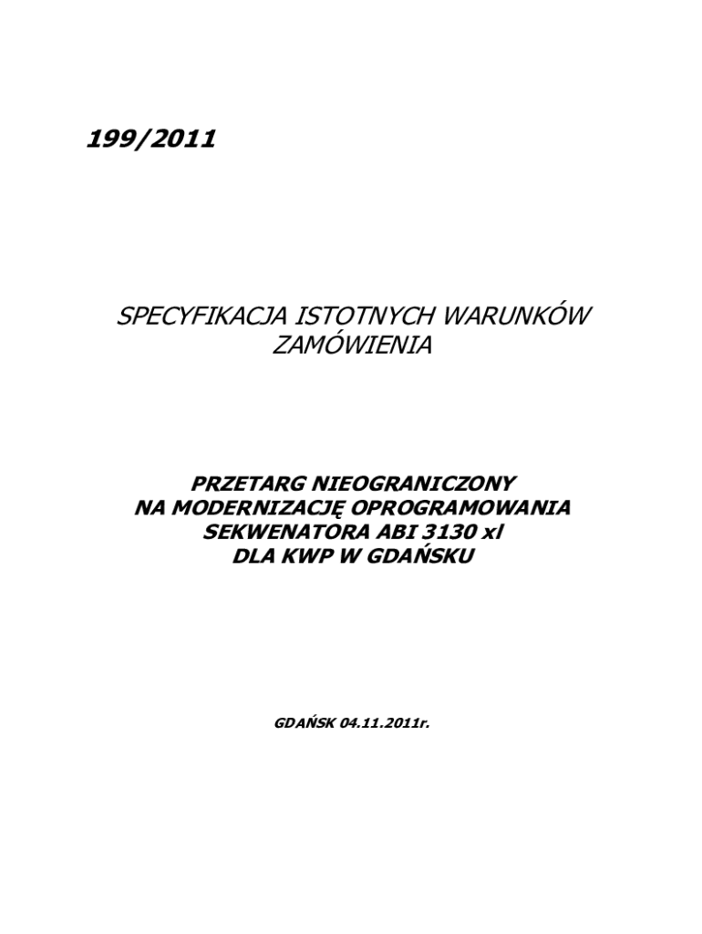 199/2011SPECYFIKACJA ISTOTNYCH WARUNKW ZAMWIENIAPRZETARG NIEOGRANICZONY NA MODERNIZACJ OPROGRAMOWANIA SEKWENATORA ABI 3130 xl DLA KWP W GDASKUGDASK 04.11.2011r.SPIS TRECI ROZDZIA I POSTANOWIENIA OGLNE